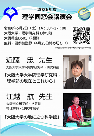 5月2日(土)に、下記の通り「理学同窓会講演会」が開催されます。同窓会員以外の方も参加できます。是非ご参加ください。